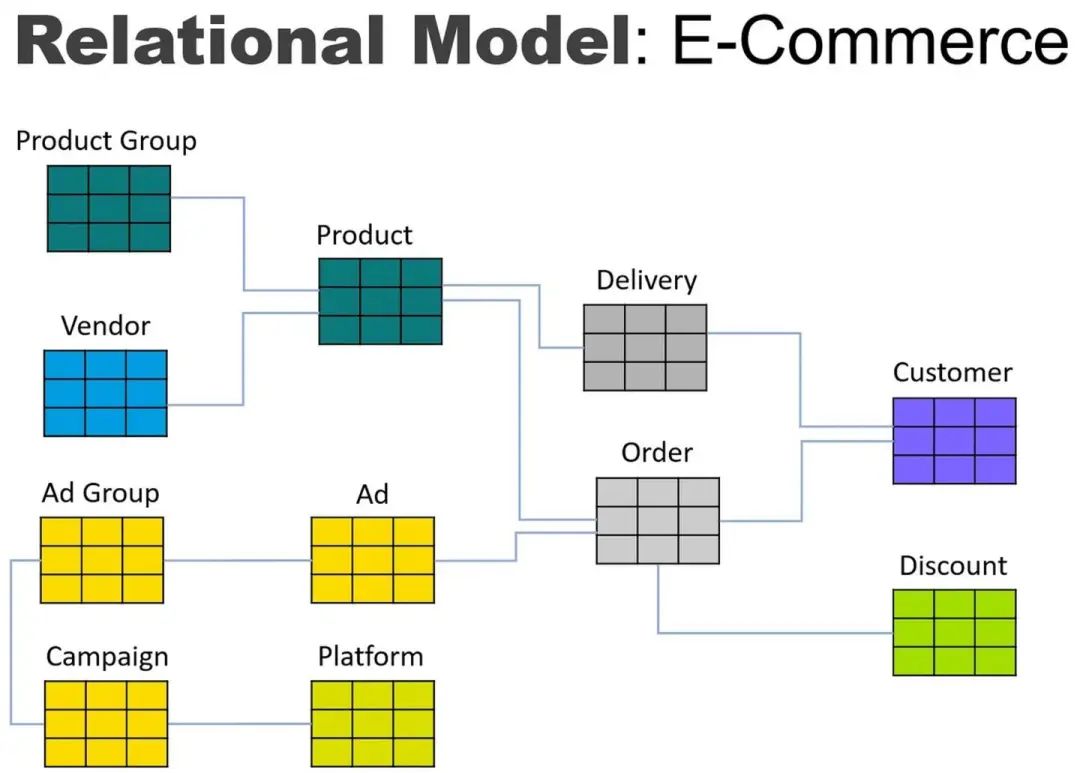 我们使用电子商务供应商的情景,将典型的关系数据库模型转化为图模型。假设这个供应商正在进行一系列数字营销活动,在其网站上接收订单并向客户发货。关系模型可能如下所示: