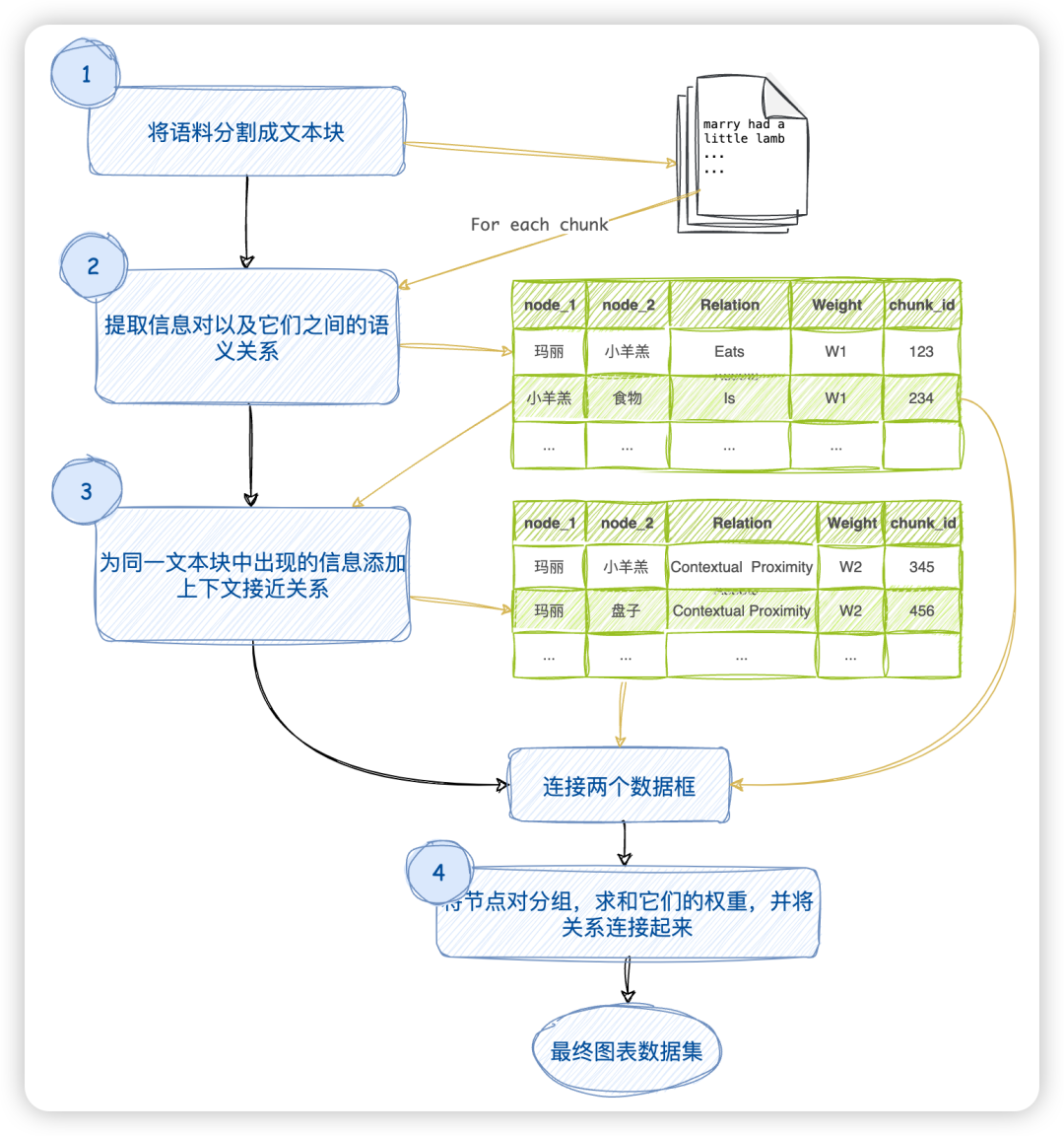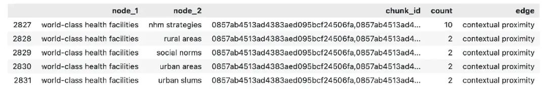 为了计算上下文相关性的关系,我们合并了数据集,将 node_1 和 node_2 合并成一个单独的列。然后,我们使用 chunk_id 作为键对此数据集进行自连接。这样,具有相同 chunk_id 的节点将配对形成一行。