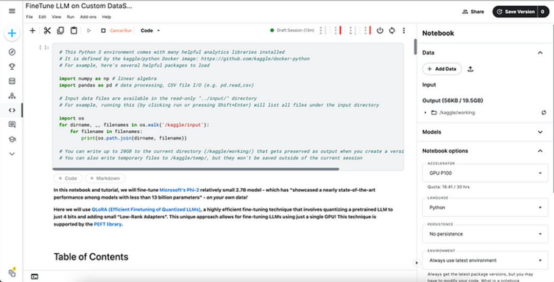 虽然我们将使用 Kaggle 笔记本进行此演示,但请随意使用任何 Jupyter 笔记本环境。Kaggle 每周提供 30 小时的免费 GPU 使用时间,这对于我们的实验来说已经足够了。首先,让我们打开一个新笔记本,建立一些标题,然后继续连接到运行时。