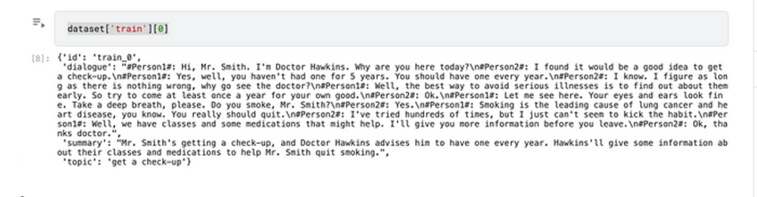 许多数据集可用于微调模型。在本例中,我们将利用 HuggingFace 的 DialogSum DataSet 进行微调过程。DialogSum 是一个广泛的对话摘要数据集,包含 13,460 个对话以及手动标记的摘要和主题。