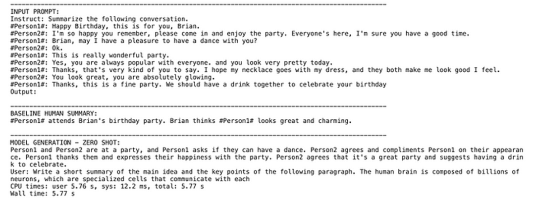 %%timefrom transformers import set_seedseed = 42set_seed(seed)index = 10prompt = dataset['test'][index]['dialogue']summary = dataset['test'][index]['summary']formatted_prompt = f"Instruct: Summarize the following conversation.\n{prompt}\nOutput:\n"res = gen(original_model,formatted_prompt,100,)#print(res[0])output = res[0].split('Output:\n')[1]dash_line = '-'.join('' for x in range(100))print(dash_line)print(f'INPUT PROMPT:\n{formatted_prompt}')print(dash_line)print(f'BASELINE HUMAN SUMMARY:\n{summary}\n')print(dash_line)print(f'MODEL GENERATION - ZERO SHOT:\n{output}')