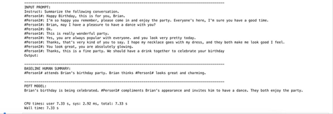 %%timefrom transformers import set_seedset_seed(seed)index = 5dialogue = dataset['test'][index]['dialogue']summary = dataset['test'][index]['summary']prompt = f"Instruct: Summarize the following conversation.\n{dialogue}\nOutput:\n"peft_model_res = gen(ft_model,prompt,100,)peft_model_output = peft_model_res[0].split('Output:\n')[1]#print(peft_model_output)prefix, success, result = peft_model_output.partition('###')dash_line = '-'.join('' for x in range(100))print(dash_line)print(f'INPUT PROMPT:\n{prompt}')print(dash_line)print(f'BASELINE HUMAN SUMMARY:\n{summary}\n')print(dash_line)print(f'PEFT MODEL:\n{prefix}')