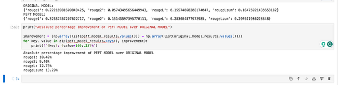 import evaluaterouge = evaluate.load('rouge')original_model_results = rouge.compute(predictions=original_model_summaries,references=human_baseline_summaries[0:len(original_model_summaries)],use_aggregator=True,use_stemmer=True,)peft_model_results = rouge.compute(predictions=peft_model_summaries,references=human_baseline_summaries[0:len(peft_model_summaries)],use_aggregator=True,use_stemmer=True,)print('ORIGINAL MODEL:')print(original_model_results)print('PEFT MODEL:')print(peft_model_results)print("Absolute percentage improvement of PEFT MODEL over ORIGINAL MODEL")improvement = (np.array(list(peft_model_results.values())) - np.array(list(original_model_results.values())))for key, value in zip(peft_model_results.keys(), improvement):print(f'{key}: {value*100:.2f}%')