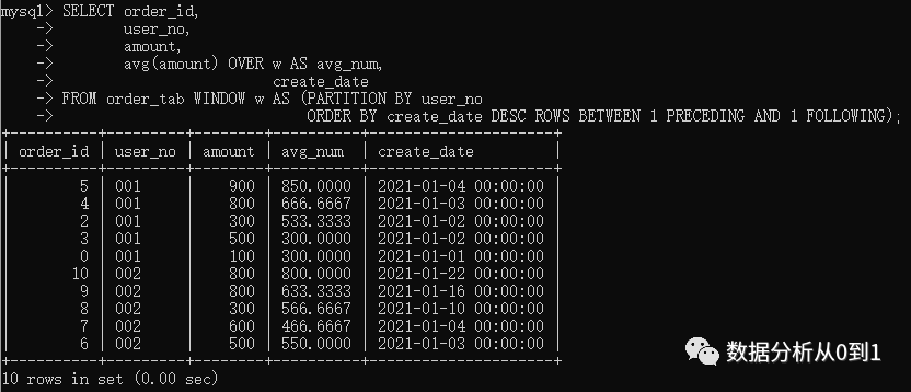 SELECT order_id,user_no,amount,avg(amount) OVER w AS avg_num,create_dateFROM order_tab WINDOW w AS (PARTITION BY user_noORDER BY create_date DESC ROWS BETWEEN 1 PRECEDING AND 1 FOLLOWING);
