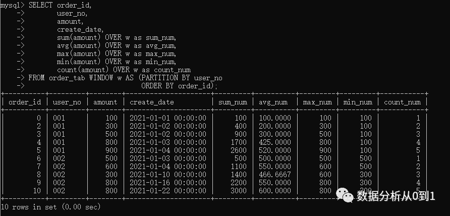 SELECT order_id,user_no,amount,create_date,sum(amount) OVER w as sum_num,avg(amount) OVER w as avg_num,max(amount) OVER w as max_num,min(amount) OVER w as min_num,count(amount) OVER w as count_numFROM order_tab WINDOW w AS (PARTITION BY user_noORDER BY order_id);