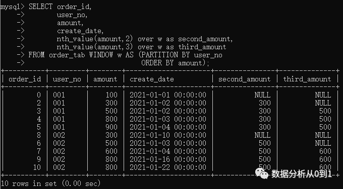 SELECT order_id,user_no,amount,create_date,nth_value(amount,2) over w as second_amount,nth_value(amount,3) over w as third_amountFROM order_tab WINDOW w AS (PARTITION BY user_noORDER BY amount);