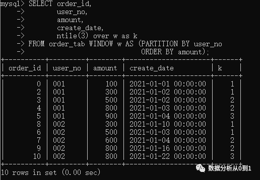 SELECT order_id,user_no,amount,create_date,ntile(3) over w as kFROM order_tab WINDOW w AS (PARTITION BY user_noORDER BY amount);