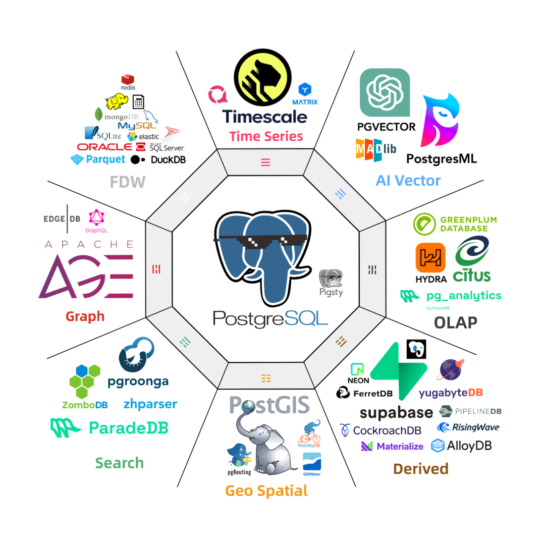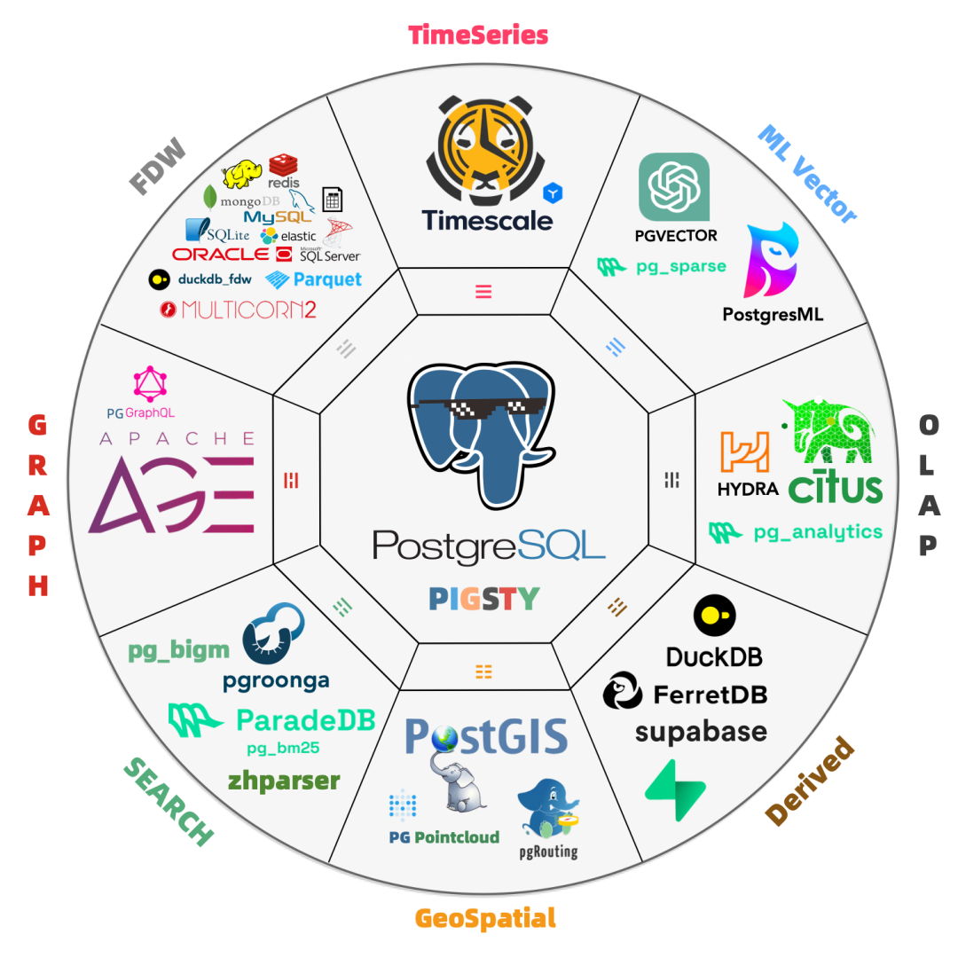 数据库领域有许多“细分领域”:时序数据库,地理空间数据库,文档数据库,搜索数据库,图数据库,向量数据库,消息队列,对象数据库。而 PostgreSQL 在任何一个领域都不会缺席。