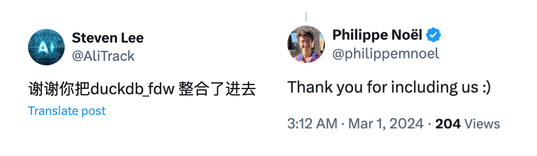 来自 ParadeDB 创始人与 DuckdbFDW 作者的感谢致意