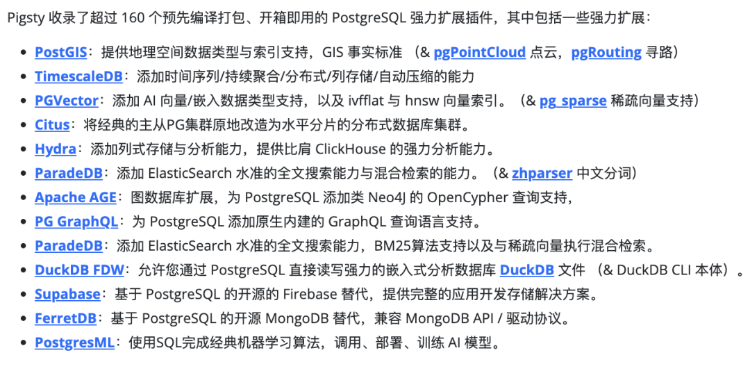 可扩展的 PostgreSQL 是这个发行版中最重要的价值主张。在刚刚发布的 Pigsty v2.6 中,我们整合了上面提到的 DuckdbFDW 与 ParadeDB 扩展,这两个插件让 PostgreSQL 的分析能力得到史诗级增强,而我们确保每个用户都能轻松用得上这样的能力。