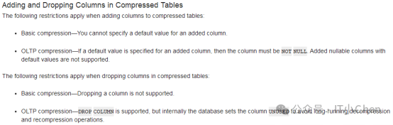 SQL> create table t1(id number(10) not null) compress;SQL> insert into t1 values(1);SQL> commit;SQL> ALTER TABLE t1 ADD UPDATE_TIME DATE DEFAULT SYSDATE NOT NULL ;ALTER TABLE t1 ADD UPDATE_TIME DATE DEFAULT SYSDATE NOT NULL*ERROR at line 1:ORA-39726: unsupported add/drop column operation on compressed tables