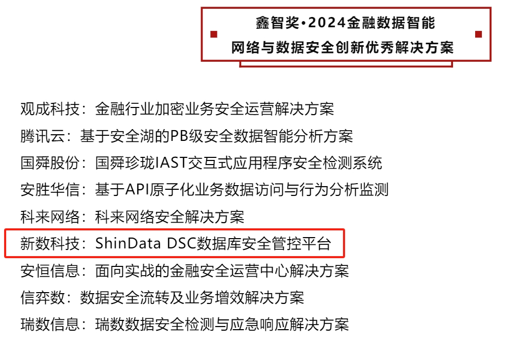 作为本届“鑫智奖”的代表性参评方案之一,ShinData DSC数据库安全管控平台以“高价值创造力和成熟的实践经验”、“科技建设、数智运营、安全底座等多位一体的综合服务领先性”赢得了专家评审团的高度认可。