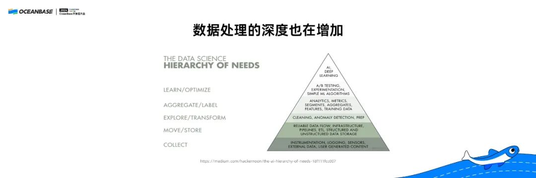 丰富的数据形态要求我们要对数据做有效处理。模仿“马斯洛需求层次理论”,数据处理也有一个层次,从最底下的收集数据、存储数据到做一般的数据查询处理,更上面的层次是现在越来越接近于用 AI 方式处理数据,甚至最后还能生成很多内容。