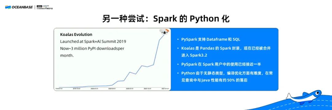 上图是 2022 年在DataBricks Summit上讲的。这是一个分布式的 PySpark,就是 Python 接口的 Spark系统。当时 PySpark 的使用率已经达到了整个 Spark 使用率的近 50%,很多人已经愿意用 PySpark 了。但是 PySpark 还存在一个问题:它的性能很差。
