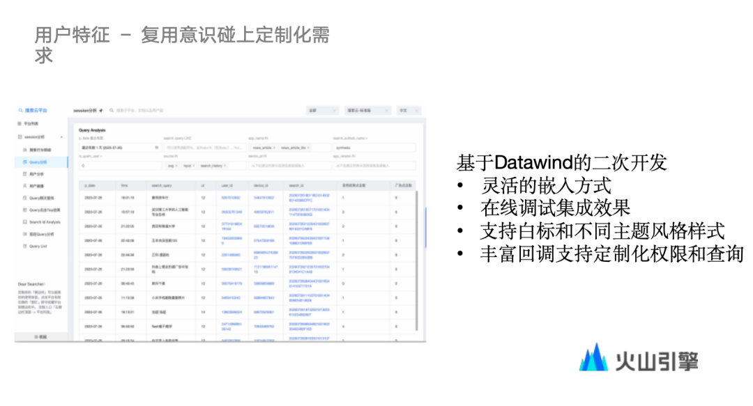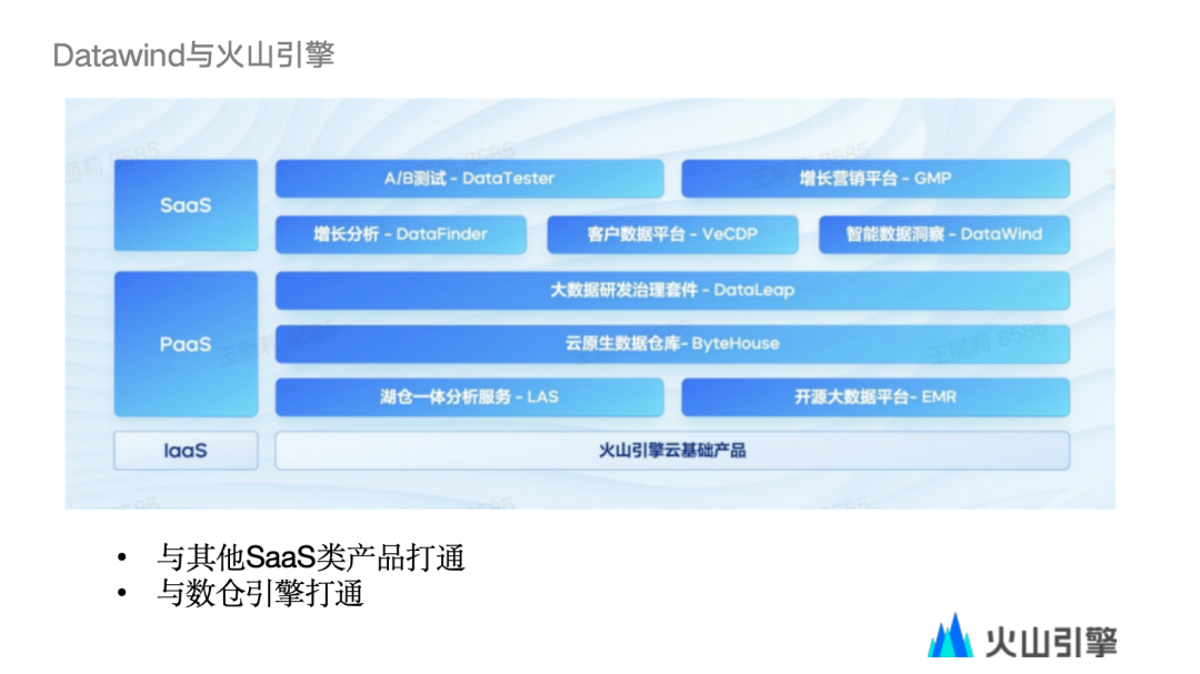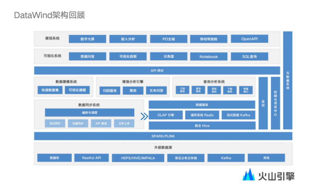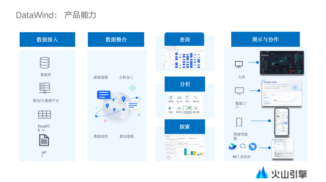 字节跳动强调效率,内部团队也有比较强的复用意识。大家在使用过程当中会遇到DataWind 无法满足的特殊场景。从 DataWind 团队的视角来讲,明显带有定制化色彩的需求,如果没法支持,就意味着公司业务方要花比较大的代价实现平台已经支持的功能,做平台类产品的同学可能都会有这样的困扰。DataWind 通过打造自己的开放能力解决以上诉求,如提供白标能力、主题配色能力等。甚至对于一些深度集成场景,为集成方提供了一系列的控制点位,允许集成方做深入定制化,如权限控制、查询控制,甚至筛选条件控制。目前,内部已经有众多业务方用以上方法复用 DataWind。在商业化过程中,客户也会基于以上开放能力完成二次开发。上图为DataWind整体架构。前文提到的大多数内容在这里都有所体现,包括零代码、低门槛的可视化建模,以及支撑海量数据快速查询的关键组件。基于产品定位、目标以及技术架构, DataWind已经有效提升了字节跳动内部分析效率,并且通过火山引擎数智平台VeDI对外输出。未来,团队也会继续从让数据分析更快、更简单的角度,进一步优化DataWind。是一款支持大数据明细级别自助分析的增强型 ABI 平台。从数据接入、数据整合,到查询、分析,最终以数据门户、数字大屏、管理驾驶舱的可视化形态呈现给业务用户,让数据发挥价值。后台回复数字“5”了解产品
