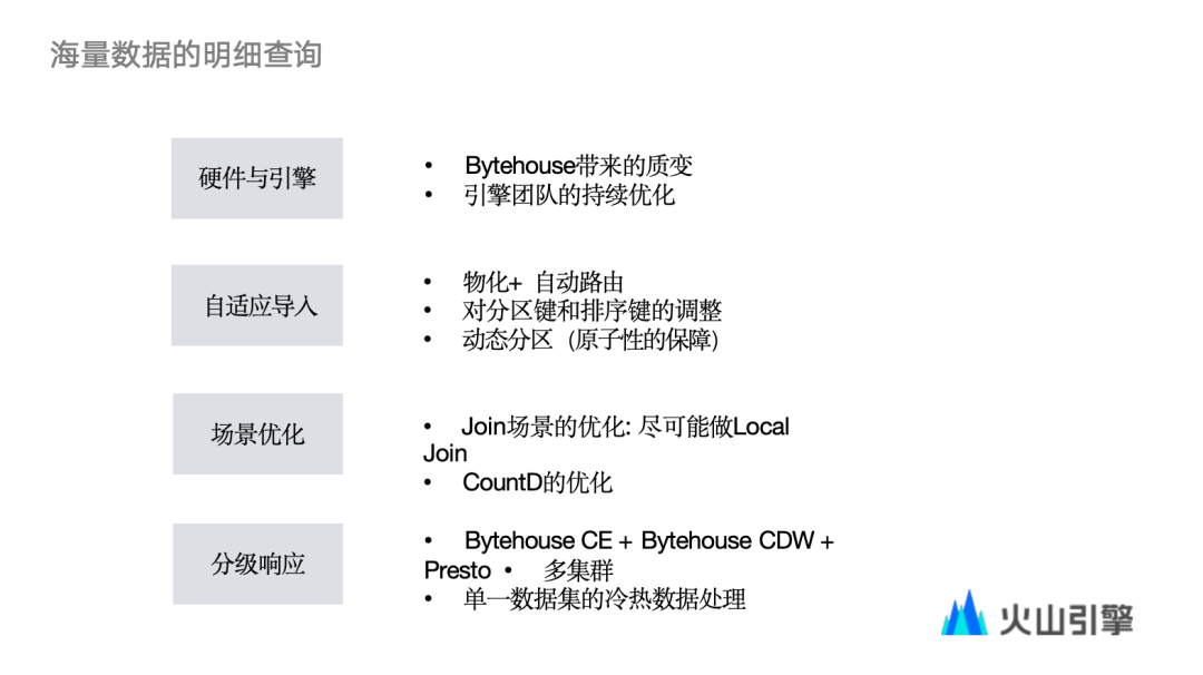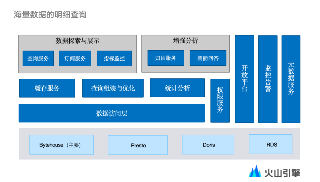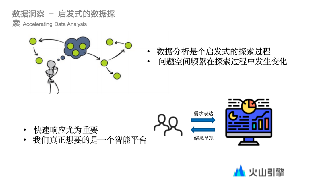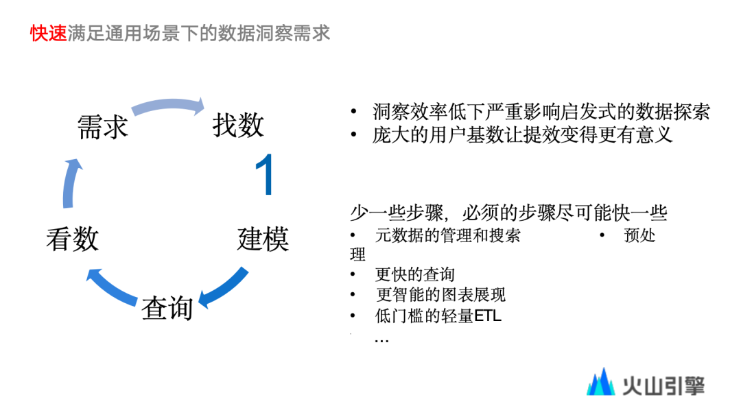 ● 第一,数据探索与分析。用户可以通过可视化查询,进行数据分析和制作仪表盘。在巨大数据量下,DataWind 可以实现秒级查询结果返回,因此用户更习惯用明细表去做数据分析。● 第二,数据协作与集成。用户可以在别的工具或平台上与 DataWind 互动。例如,用户可以把关心的仪表盘推送到自己的邮箱或者办公软件上,或者在某些指标出现异常或者剧烈波动的时候,通过飞书或者邮件进行通知。除此之外,有一些业务方的数据分析场景是相对定制化的,业务方也会通过 DataWind 比较强的开放能力去集成,通过一系列的开放接口去实现定制化诉求。● 第三,AI 能力融合。近两年,字节跳动内部对 AI 能力的诉求越来越强,越来越多的用户希望通过 AI 的能力,让数据分析变得更加智能。一种诉求是希望借助机器学习的方法,对数据进行分析和预测;另外一种则是希望这个平台能够帮用户找到值得关注的指标维度,实现更智能的数据洞察。DataWind 第一个版本诞生于2018 年,那时它还是一个简单的 SQL 查询工具,用户通过写 Query 提交去查询结果,但等待时间相对比较久。后来逐步拓展了可视化查询的能力,让越来越多没有技术背景的人通过拖拉拽的方式,去上手数据分析和仪表盘制作。数据分析本身是离不开数据的。有一个常见的场景,想要分析的数据在数仓还没有,或者已有的不是你想要的,这对一个没有技术背景的用户来说,做数据分析的过程可能就会被卡住。所以,我们又构建了一系列的数据准备能力,以零代码低门槛的方式帮助没有技术背景的业务人员轻松完成 ETL。为了适应不同场景的数据展示诉求,我们引入了完善的移动端驾驶舱大屏能力。在 2021年左右,为了更方便的被第三方系统集成,DataWind开放平台正式构建。目前,DataWind 平台基本上已具备了一站式的数据服务和分析能力,包含数据接入、数据整合、数据集成、查询、分析、探索、协作等一系列功能。了解火山引擎的朋友可能都知道,火山引擎包含了很多数据产品,也不乏数据分析类的产品,那么 DataWind 跟其它产品的区别和联系是什么呢?从产品定位来讲,特定领域的分析产品都会有一些场景相对固定的深入的数据分析和展示方法,如 AB测试中的显著性、用户行为分析的留存分析、某个用户的行为重放等等。DataWind则是更关注通用场景下的数据分析诉求的满足情况。另外,DataWind能够打通企业内部绝大多数的数据资产,与火山引擎的其它数据产品保持紧密联动,如分析型数据库 ByteHouse、湖仓一体分析服务LAS 等,也可以跟 VeCDP、DataFinder 等产品的数据直接打通实现数据查询。通过打通各类数据,用户可以很便捷地把用户行为数据和数仓其他数据融合在一起,用DataWind进行分析。DataWind之所以力求对常用的分析场景、分析方法和数据资产做到全覆盖,是因为数据分析过程本来就是一个灵活、启发式的探索过程,这与做问题排查非常类似。分析原因之前,要设置多个假设。验证一个假设后,会排除一些可能性,又会产生新的想法。在这个过程中,问题的领域有可能发生变化,如营收数据异常、或重新分析用户行为数据、查看监控数据、发现用户留存或者用户行为有异常等。在启发式的探索过程中,快速响应非常重要的。如果不能做到快速响应,验证其中某种假设将耗费很长时间,等结果出来时可能已经忘了之前的分析思路。因此,理想情况是有一个强大的数据分析系统,只要问问题,就能快速准确地产出结果。要知道到哪里能找到相应的数据,这些数据要如何组合起来,基于这些数据,要构建出什么样的数据模型来做查询,去分析结果。分析完结果以后,又可能会产生新的问题,这个链路很容易变得非常耗时,甚至有时候在一个团队内都很难去做到闭环,影响整个数据洞察的效率。考虑到 DataWind 在字节内部有众多用户,对整个公司的效率影响非常明显,这条链路需要变得更快、更简单。思路其实也很明确,就是要省掉一些不必要去做的事情,同时让必须要做的步骤更快地完成。按照这个思路,有很大的优化空间,比如把元数据的管理、指标维度体系做好,优化元数据的搜索、排序和推荐。当用户有一个新想法时,可能发现已经有人做好了相应的图表和仪表盘,就可以直接查或者申请一下权限。又或是相应的仪表盘虽然没有,但是相应数据的底表在数仓里已经有了,可以直接去查询。这些都能够让链路变得更快。大多数的场景下,查询是不能省略的,所以提升查询性能非常重要,尤其是在巨大数据量上实现更快的查询,其重要性更为突出。这方面如果不能得到改善,通常来讲,就只能做两种选择,一是减少数据量,或者去做一些预聚合,但问题是在启发式的数据探索过程中,会不断产生新问题,很容易发现维度、指标或力度不满足需求,又需要去跑数据;二是用大数据量的细粒度数据去查,需要用户等待时间较长。所以,近年来,DataWind 一直在想方设法地提升查询性能。1. 海量数据的明细查询