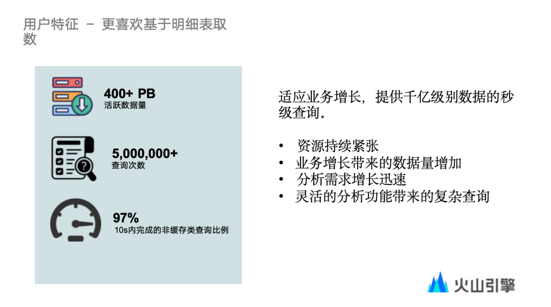 提高查询性能后,字节跳动的用户更加喜欢用明细表来做数据分析,内部一周内被查到的数据量,基本上维持在400PB以上。每天会有 500 万次以上的查询,查询数据量过亿甚至过10亿行的这种查询是司空见惯的,基本上查询都可以在 10 秒内完成。保持这样的水准其实是比较困难的,因为内部业务在快速的发展,分析需求也在快速增长,表规模也变得越来越大。在过去半年,查询量增长了 50% 以上。在不久之前,像抖音等业务方的查询数据量在 10 亿行左右,而现在很多数据分析已经是基于千亿行的规模。在硬件资源基本不增加的情况下,可能很努力的把大查询从30秒左右提升到了10秒,甚至5秒内,用户觉得体验变好了,又会上更大规模的数据。这也促使DataWind不断地去提升查询性能,关注的指标是 10 秒内的查询占比,内部认为在这个时间量级内完成响应,通常不会阻碍启发式的数据分析和探索的过程。为了实现在大数据量下快速返回查询结果,DataWind在很多方向上做了努力。首先,在硬件与引擎方面,收益是非常可观的。更高的机器与网络配置,加上在大数据量查询上面更有优势的引擎,往往已经能够带来非常明显的体验提升。火山引擎的 ByteHouse 是我们目前使用最频繁的引擎,其性能比开源版本 ClicHouse 更加突出,也会拿DataWind的查询场景去做优化,为整体的查询性提供基本的保障。其次,在应用层面,我们也会做各种各样的优化尝试,比如尽量减少需要扫描的数据量,减少不必要的消费。我们尽可能的让数据的存储方式,更匹配其查询方式,因为 DataWind 本身就是在通用场景下的数据分析平台,要做到这一点是有一定难度的,根据用户的查询方式,去重新调整数据的分区分片方式,以及索引等,就会有明显的提升。此外,还有一些常用的场景,如 join或者是在BI领域使用得很频繁的计数去重。对这些频繁使用,但是性能往往比较差的场景, DataWind做了特定的优化,能很显著地改善用户体验。最后,就是不同的引擎对资源的需求也是不一样的。比如说,ByteHouse有两个版本,其中 CE 版可以提供比较好的性能,但存储计算不分离,成本相对较高。CDW 云数仓版的性能没有 CE 版那么卓越,但是它是存算分离的结构。我们内部也会根据用户的数据量、对查询响应的预期,去做数据存储上面的分解,把硬件资源划分成规模不同的集群。根据数据的规模,还有查询的方式,去选择最适合的引擎和集群。上述内容也体现在了架构中,底层有一些不同的引擎,每种引擎都由火山引擎的团队针对场景做优化。数据访问层屏蔽了这些对引擎访问方式的差异。对一些重要程度比较高的仪表盘,DataWind会做预刷的处理和缓存。对查询的统计分析,我们希望DataWind能够影响数据的存储方式,进而去影响查询的组装和优化,服务于不同场景的模块。2. 非技术人员也想做数据建模