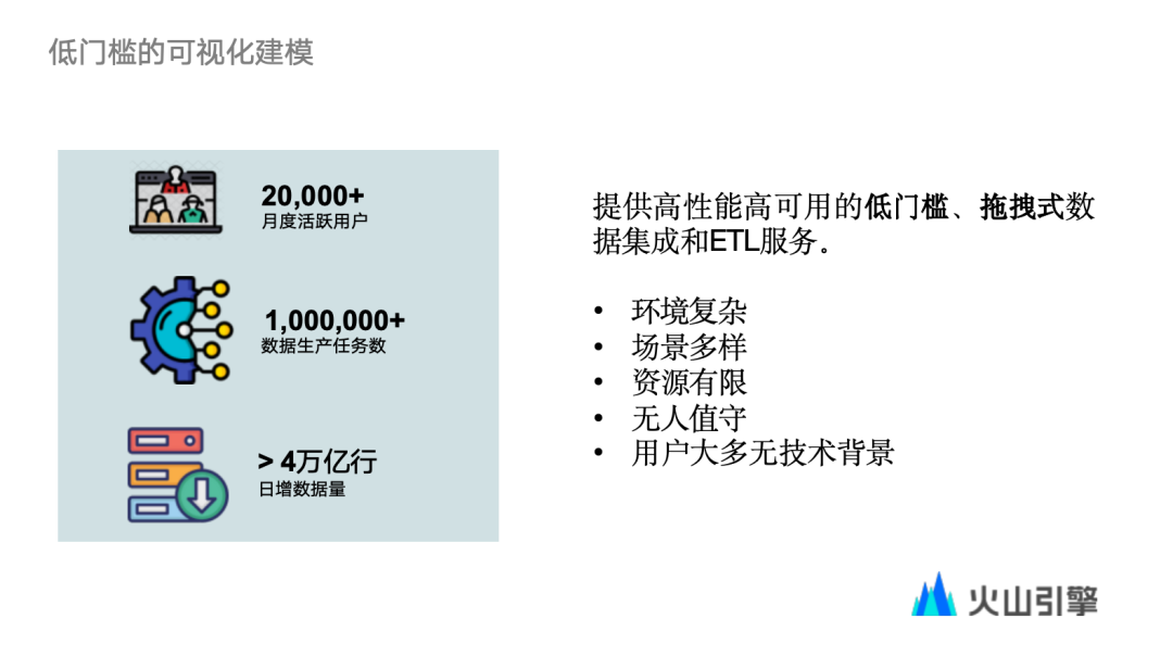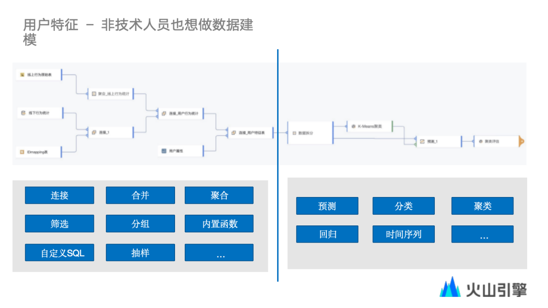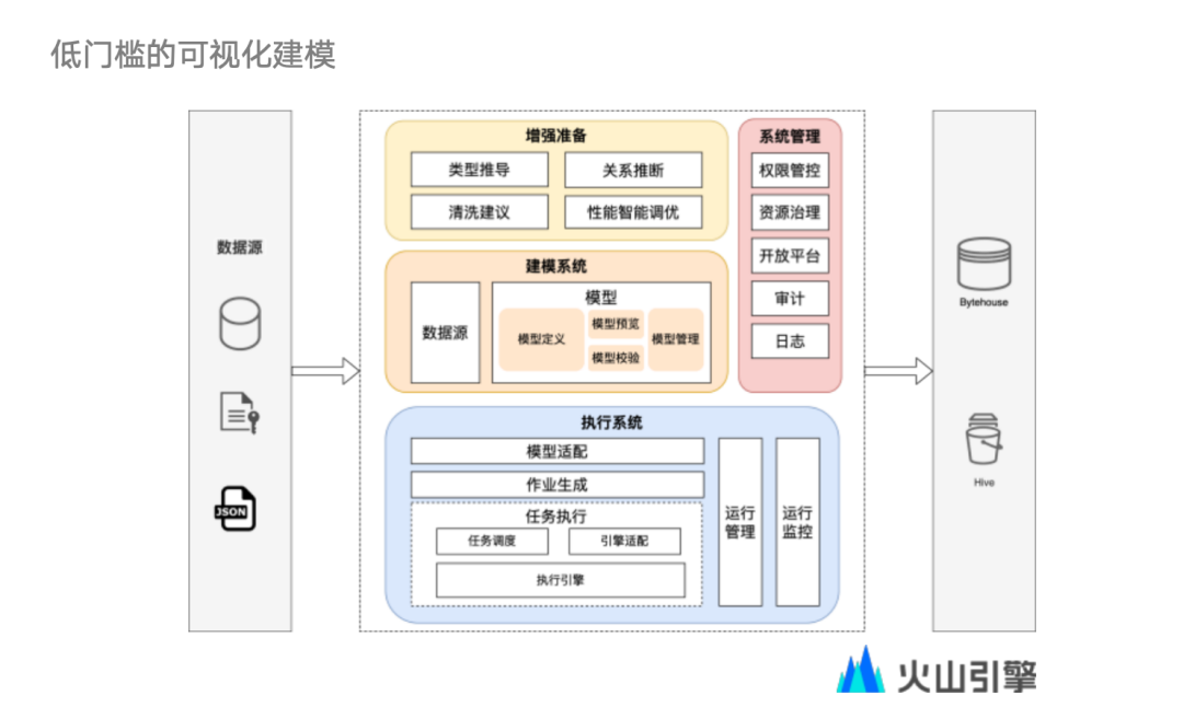 有些场景下,现有数据不能直接查询,必须做一些处理,如筛选、连接、合并。或者在更复杂的场景下,可能需要把Mysql 的表跟 Hive 的表去做 join,这时就免不了要做一些数据模型构建。DataWind的主要用户大多都不具备技术背景,如果遇到数据上的卡点,往往无法独立写数据处理任务,再把这个任务调度起来,在实时的场景上可能就更为吃力,这样就会影响整体效率。因此能够做数据建模工作,是 DataWind 用户一个非常迫切的需求。通过打磨,DataWind满足了这部分的需求——通过可视化的方式构建数据模型。随着模型的构建,还能够探查到到每一步数据的具体内容,真正做到了所见即所得。DataWind在数据建模的能力上也是比较完备的,能够从超过40种数据源中抽取数据,有丰富的算子,甚至包含很多机器学习相关的算子,可以完成非常复杂的模型构建工作。与查询场景类似,可视化建模也是为了满足通用场景设计,而增加了复杂度。用户的使用场景、数据源,包括数据本身的大小、构建出来的数据模型,会不会存在数据倾斜或者数据膨胀这种情况,其实都是未知的。资源和人力都有限的情况下,我们要求整套系统具备比较好的稳定性和性能,能够尽量做到无人值守。用户本身没有太多的技术背景,往往不具备大数据开发领域的知识,比如参数怎么去调、为什么报错……这些都要求DataWind的平台做得更加智能、简单和友好。从结果来看,DataWind还是做得比较成功的,这个不用写代码,门槛相当低的数据建模,在字节跳动内部也被广泛使用,任务量和数据规模也非常大。走商业化路线后,使用的客户不仅多,还给了非常正向的评价。从架构上看,数据源、执行系统、还有最终数据的存储,其实跟一般的大数据开发平台类似。DataWind值得强调的是运行管理和监控,为了让内部还有客户环境,都能够尽可能的做到无人值守,DataWind会在任务执行当中加入一些检测,比如数据是否发生了倾斜膨胀,再及时去调整任务的执行。为了尽可能的让门槛降低,DataWind会辅助用户去做一些操作,比如说类型的推导,根据数据源的某一个列的类型,以及后续的一些操作,去推断其最终的类型,也会尝试根据字段类型、字段名等,推断几张表之间是否存在关联关系,让用户的操作步骤更加简短,构建数据模型时更加方便。3. 随时随地做数据分析