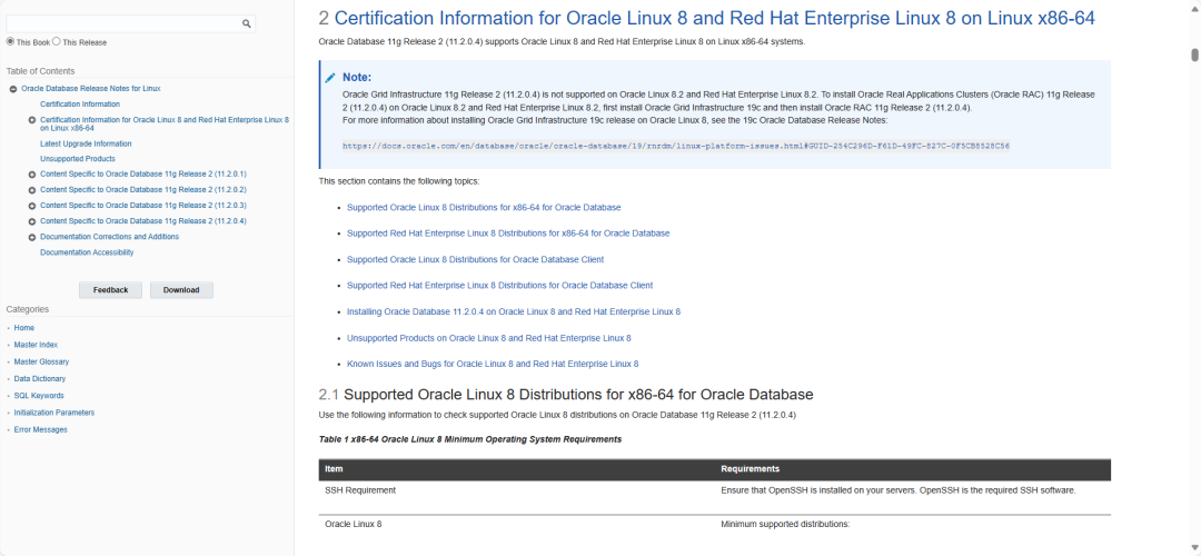 同样11GR2的官方文档也进行了相应的更新,增了关于OEL8以及RHEL8的说明,支持11.2.0.4数据库,但是8.2以后的系统不支持11.2.0.4的GI,如果想要实现高可用,需要安装19C的GI