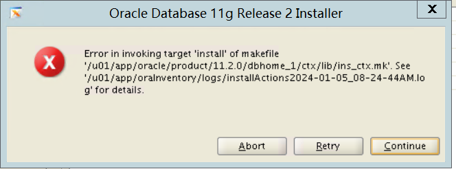 Log file location: u01/app/oracle/product/11.2.0/dbhome_1/cfgtoollogs/opatch/opatch2024-01-05_20-35-55PM_1.log