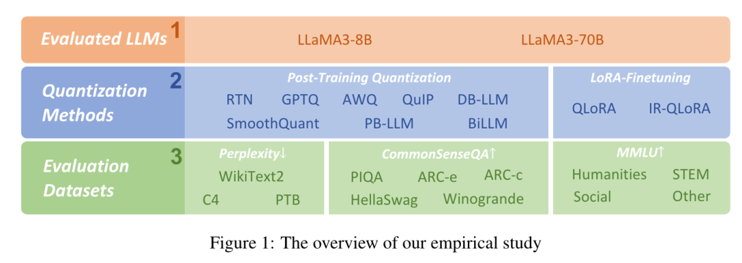 通过官方仓库获得了预训练的LLAMA3-8B和-70B模型,选择了具有广泛影响和功能的代表性LLM量化方法: