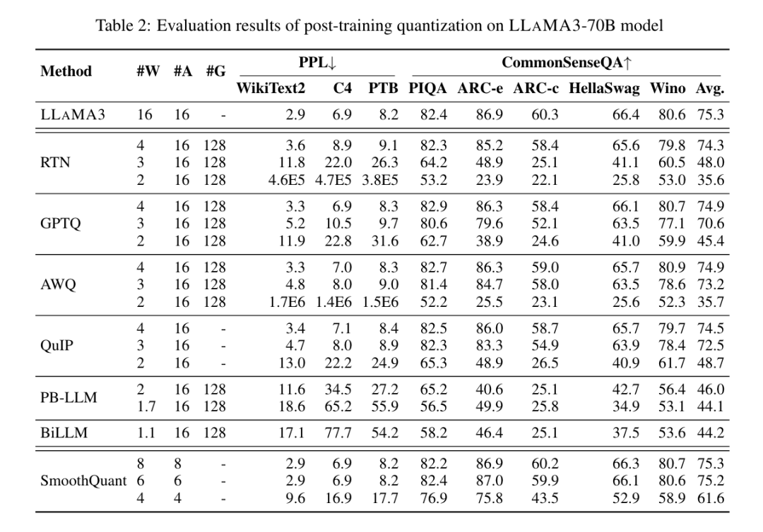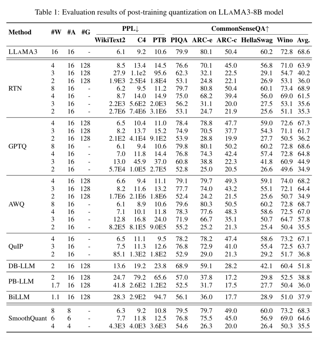 其中Round-To-Nearest(RTN)是一种普通的四舍五入量化方法。GPTQ是目前最高效、最有效的仅权重量化方法之一,它利用量化中的误差补偿。但在2-3比特下,当对LLAMA3进行量化时,GPTQ会导致严重的准确性下降。