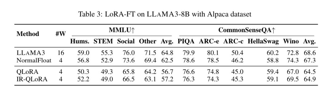 类似的现象也出现在CommonSenseQA基准测试中。与没有LoRA-FT的4比特对应版本相比,使用QLoRA和IR-QLoRA微调的模型性能也下降了(例如,QLoRA的2.8%与IR-QLoRA的2.4%)。这进一步证明了在LLAMA3中使用高质量数据集的优势,因为一般数据集Alpaca并没有对模型在其他任务中的性能做出贡献。
