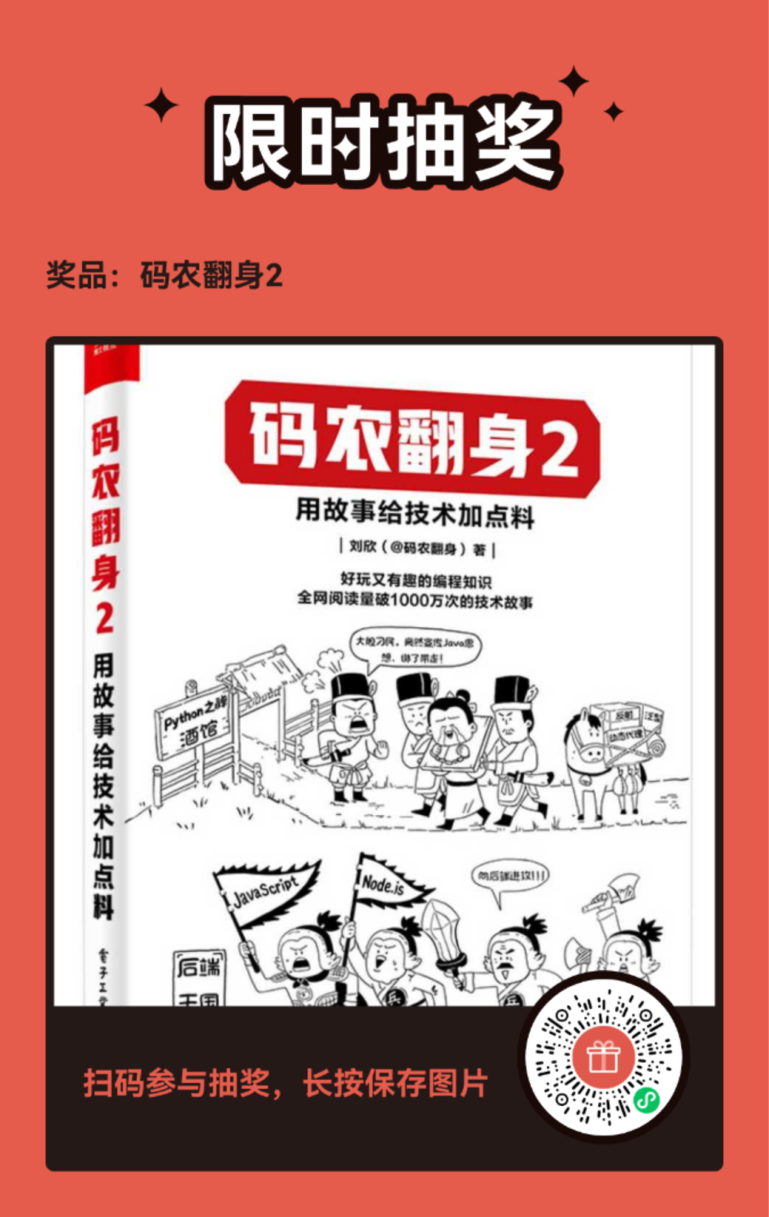 看看这本书的封面就知道,《码农翻身2》依然是用故事的方式讲解技术!在这本书里,著名的张大胖又会遇到各种各样的挑战,不得不“重新发明”各种知名软件和技术。编程语言王国之间依然争斗得你死我活,今天Java向Python渗透,明天JavaScript就向Java猛烈进攻。而C语言春节回家,发现只有自己没有对象,十分悲催。MySQL和Redis互相看不顺眼,不断向对方使绊子。这本书的特点就是把看似枯燥乏味的技术,变成好玩有趣的故事。在故事中让主人公不断遇到问题,不断制造悬念,吸引大家看下去,不知不觉中就把技术原理给掌握了。这本书和《码农翻身》一样,每篇文章都是独立的,你不用从头到尾去看,完全可以放在桌边/床边,随时挑选一篇小故事去阅读,看完一篇就可以放下,以后再看。所谓“开卷有益”,希望你随手翻翻就能够掌握一点技术知识。今天,这本书开启了5折优惠,全彩印刷,用故事给技术加点料,原价118元,现在仅需59元,第一批仅有5000册,赶紧抄底!老读者肯定会问:这本书和6年前的《码农翻身》有什么区别呢?其次《码农翻身》主要是关注计算机的底层,比如进程、线程、硬盘、键盘、TCP/IP、Socket、HTTPS、数据库原理、Web服务器原理等。《码农翻身2》则把目光稍微往上移了一点儿,关注了一些中间层及以上的东西,比如负载均衡、双机热备、数据复制、缓存、分布式ID等。但是我选择的时候,依然会把稳定的、不容易过时的技术作为重要标准。虽然这本书偏向于服务器端的知识,偏向后端编程,似乎更适合后端程序员,但是它并没有讲技术细节,主要是讲技术原理,所以对前端程序员甚至产品经理来说,也是一个了解后端技术的很好机会,看了这本书,就可以更好地和后端程序员“战斗”了。另外,为了帮助大家理解一些技术原理,《码农翻身2》光是插图就画了200多张,插图之多都快赶上一些名不副实的漫画书了。总之,我希望这本书能让大家掌握技术原理和本质的同时,又能读起来很爽。对了,《码农翻身》和《码农翻身2》的套装也出了,都是半价,需要的话赶紧抄底👇
