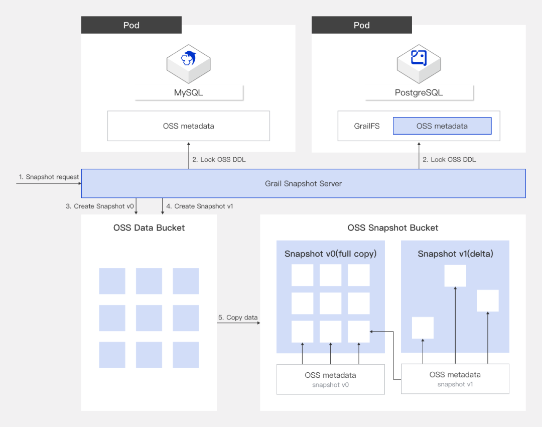 4. 初次备份时,全量拷贝OSS中的数据,并将元数据dump到OSS中,生成snapshot v0;后续备份时,会根据元数据,拷贝OSS中增量的数据,同时dump元数据,生成snapshot v1、v2、v3等。
