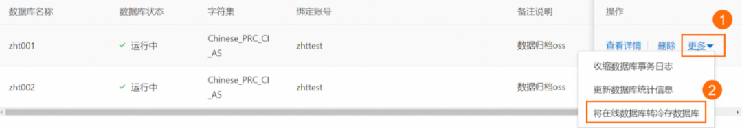RDS SQL Server版:登录控制台,在实例的数据库管理页面,进行将数据库转冷存数据库的操作。