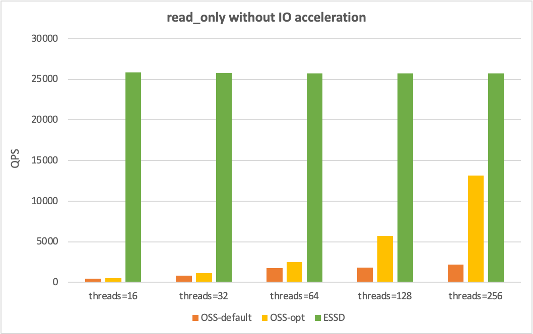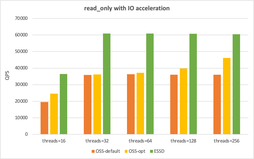 默认配置下,归档数据QPS性能可达ESSD PL1数据QPS的59.7%。 优化配置下,归档数据QPS性能可达ESSD PL1数据QPS的76.4%。 开启 IO 加速后,归档数据默认配置下的只读性能提升了15倍,优化配置下的只读性能提升了2.5倍。