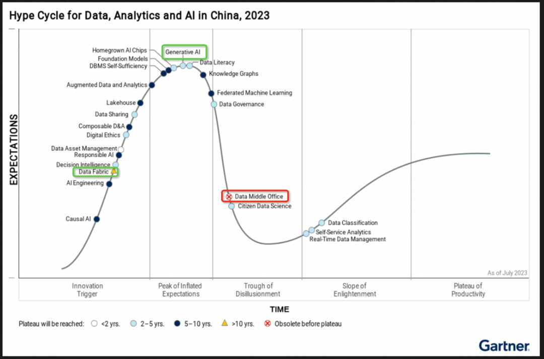 随着Gartner发布2023年中国数据、分析和AI技术成熟度曲线,未被收录的数据中台正式成为历史。从2015年提出受到热捧,到变得备受质疑,直至被市场抛弃,究其原因是投入大、成本高。虽然保障了数据供给的一致性和质量,但需求响应以周、月为单位,让业务侧难以忍受。而与之对应的,近几年Data Fabric作为一种新兴的数据管理设计理念,正获得各厂商的青睐。Data Fabric重点强调敏捷数据交付,通过优化跨源异构数据的发现与访问,将可信数据以灵活且业务可理解的方式交付给数据消费者,实现敏捷的数据交付。Gartner认为,Data Fabric能够帮助企业减少50%数据管理人力成本和70%工作量,并加快价值实现速度。不过,如何有效降低数据分析门槛,实现数据价值的最后一公里传递,依然是当前业务面临的一大挑战。这一问题核心在于如何让非专业人士,包括业务决策者、一线员工,都能便捷地使用数据,从而释放数据潜在价值。值得庆幸的是,生成式AI技术的出现为解决这一难题带来了曙光。生成式AI颠覆了人机交互的传统范式,赋予每个人利用AI进行低门槛数据分析的能力(如通过自然语言查询与分析数据)。我们在Gartner报告中也观察到,生成式AI在极短的时间内即跃升至热门关注区间的顶峰,这充分反映了市场对于借助生成式AI降低数分门槛的高度期许。综上,Data Fabric与生成式AI的强强联合,不仅能够实现敏捷数据交付,还有效降低了数据分析门槛,让人人都能数据分析成为可能。阿里云瑶池数据库旗下的数据管理DMS作为阿里云统一的用数平台,在2021年初就开始探索使用Data Fabric理念构建逻辑数仓来加速企业数据价值的交付,2023年推出基于大模型构建的Data Copilot,降低用数门槛。