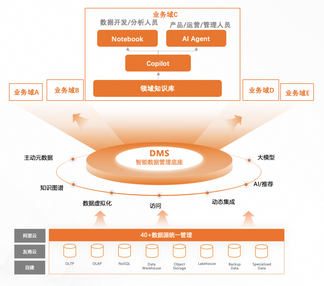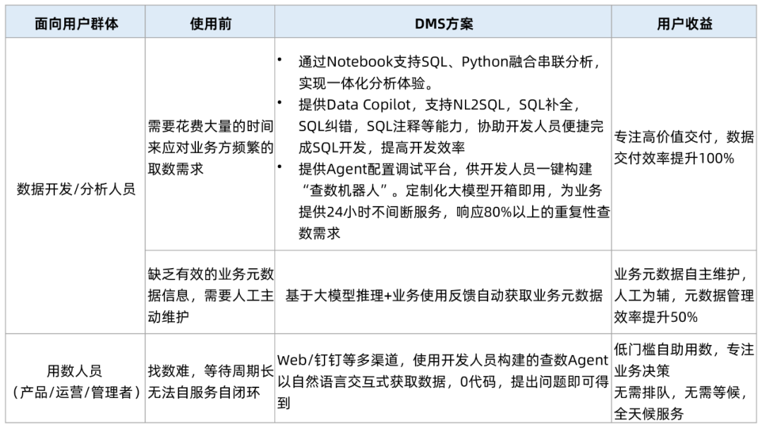 DMS数据工作站这位「新同事」的加入,可以结合大语言模型为业务开发、数据开发、分析师和数据运营赋能,提升数据交付效率和数据自助分析的效率。