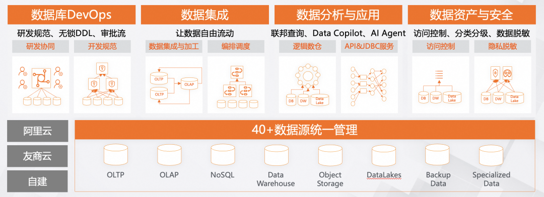 在进入分析场景介绍前,先为不熟悉DMS的同学进行一个简单科普,DMS是阿里云在2013年发布的数据管理服务,作为阿里云统一的用数入口,其提供了包括多云多源管控、数据安全、数据库开发管理、数据分析等功能,是多年来阿里集团用数最佳实践,能够满足企业一站式数据管理诉求。上线至今服务了超过10万+企业客户,产品周活6万+。如上图所示,DMS通过Data Fabric(主动元数据、知识图谱、数据虚拟化、动态集成、访问控制、AI/推荐)+大模型构建智能数据管理底座,通过数据管理底座底座赋能数据分析与应用场景。Data Fabric的整体能力我们留待下次分享,本次主要针对DMS数据分析与应用结合场景拆分的四个核心功能进行介绍:安全托管、Copilot、Notebook、AI Agent。▶︎ 安全托管