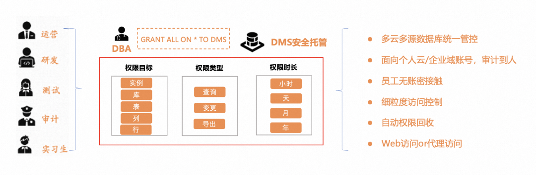 在数据分析与应用场景中,用数管控是基本要求,安全托管是数据管理DMS在阿里集团数据库权限访问控制最佳实践,为企业提供一系列数据库权限管控的集合,可帮助企业实现多云数据库统一权限管理,进而确保用数过程的安全。▶︎ Copilot