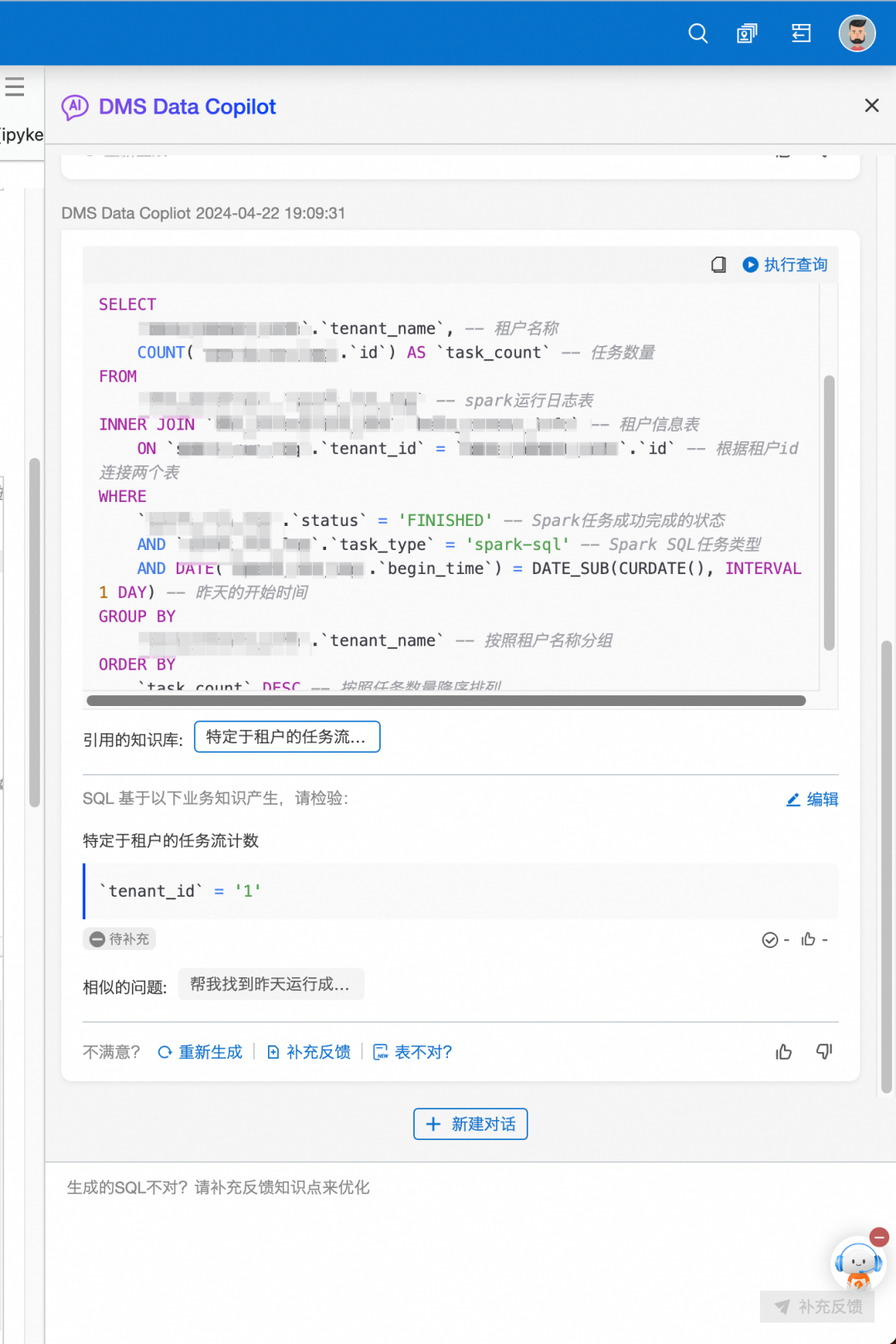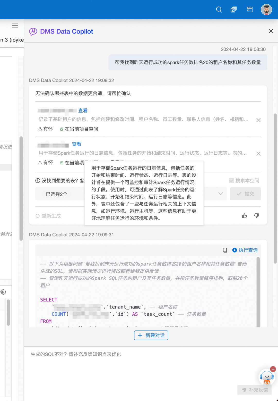 DMS Data Copilot支持用户通过自然语言的方式生成SQL,相较于其他NL2SQL场景对大规模精准数据标注的高度依赖性,DMS巧妙借力于先进的大模型技术,能够对用户过往执行过的SQL语句以及历史对话记录进行深层次的知识推理与挖掘,进而构筑并自主维护一个专业且实时更新的领域知识库,这一过程几乎无需大量人工介入。在实际应用中,DMS Data Copilot在互动交流的过程中能够展现出卓越的理解力和应变能力。它能理解用户的复杂意图,并依据用户的历史行为和当前需求,智能推荐合适的表,生成相应的SQL片段。同时,对于Copilot使用的每项信息,用户都能够进行灵活调整和优化,这无疑显著提升了系统的冷启动效能和结果准确度,使得用户与数据库之间的沟通更为流畅自如。▶︎ Notebook