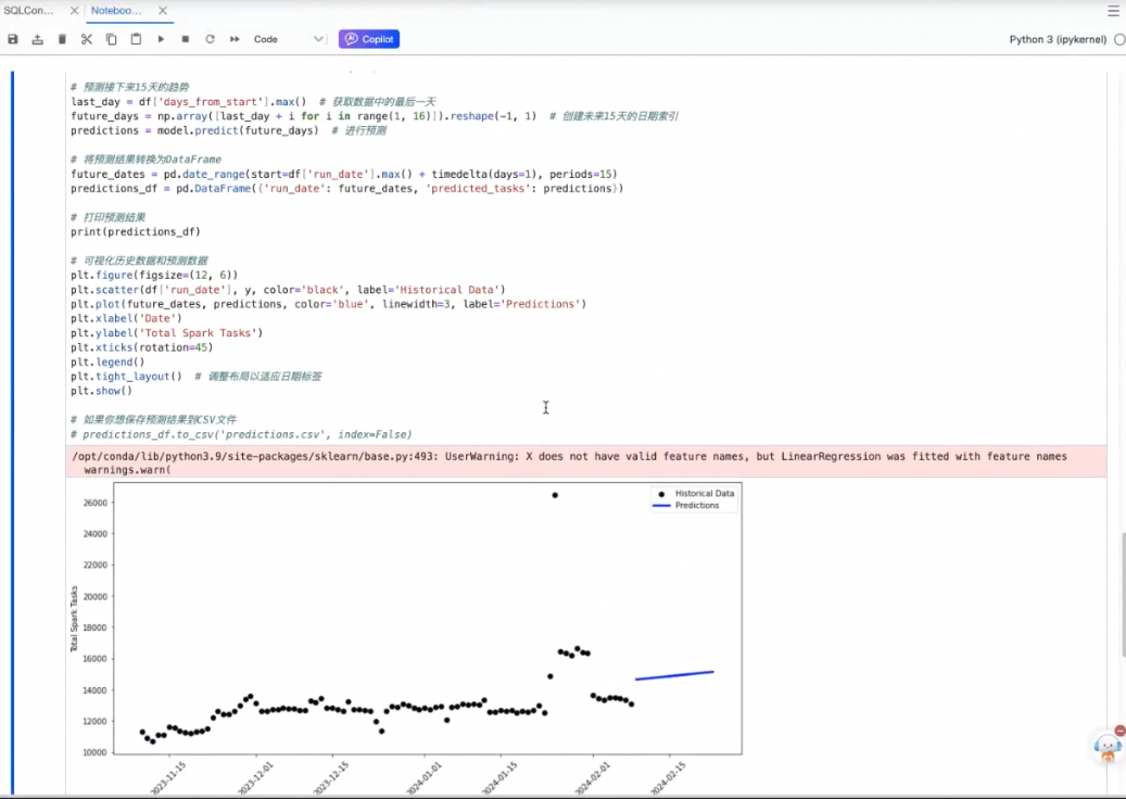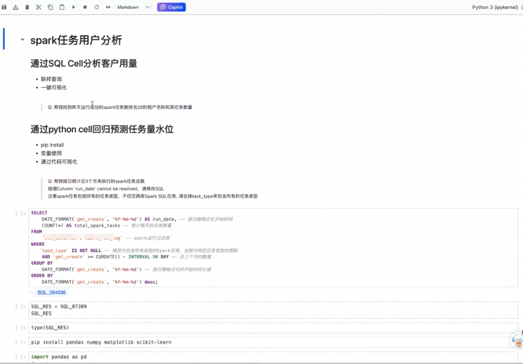 2)使用Notebook对任务趋势进行分析,过程中可以通过开启Copilot来生成分析所需的SQL快速应用到Notebook中。