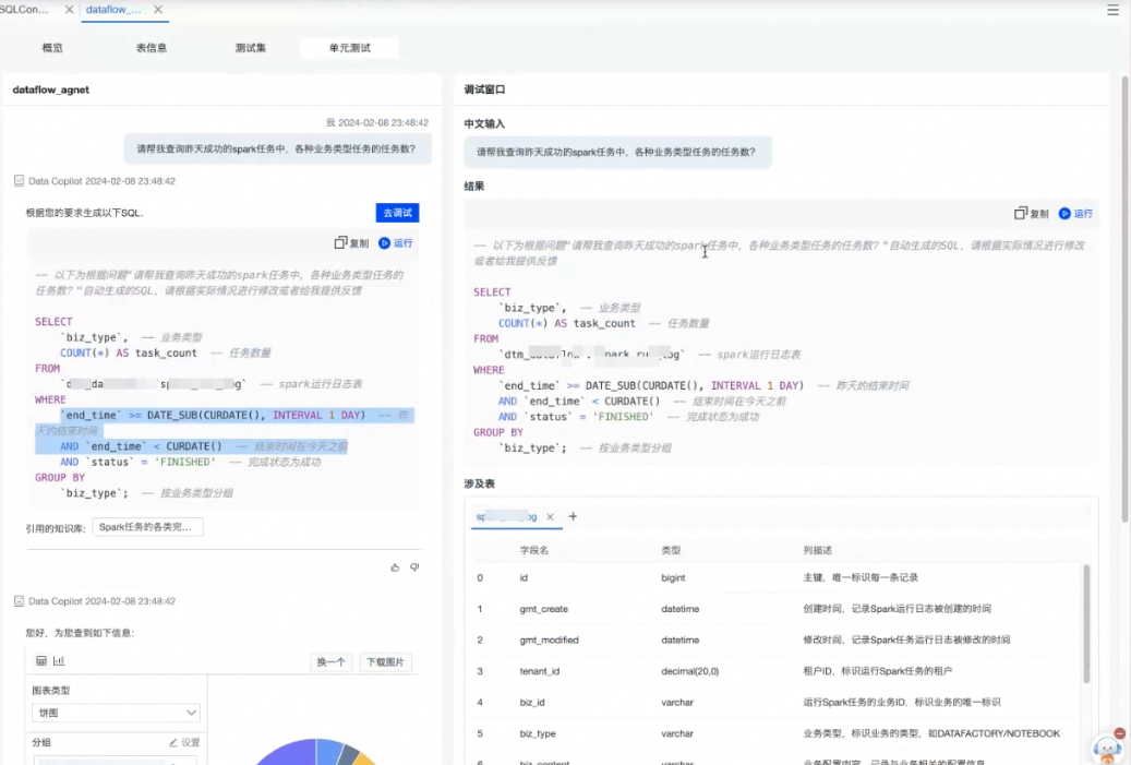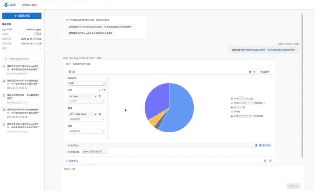 5)通过自然语言来获取任务相关的查询和分析结果(比如询问“帮我分析下成功的任务中,各种业务类型的任务分布”)。「DMS数据工作站」预计将于5月中旬开启公测,公测期间用户可免费使用,敬请期待~数据管理DMS(Data Management)是一款支撑数据全生命周期的一站式数据管理平台。DMS提供全域数据资产管理、数据治理、数据库设计开发、数据集成、数据开发和数据消费等功能,致力于帮助企业高效、安全地挖掘数据价值,助力企业数字化转型。了解阿里云DMS产品详情:🔗 https://www.aliyun.com/product/dms