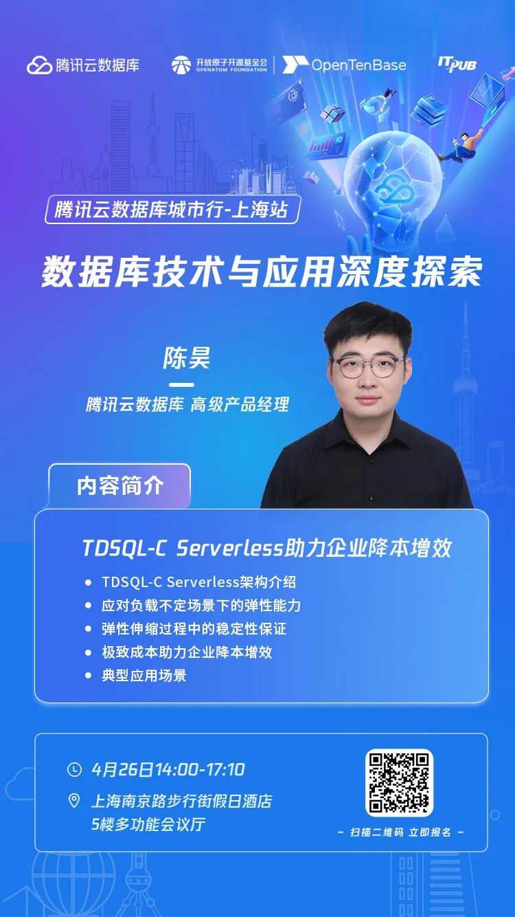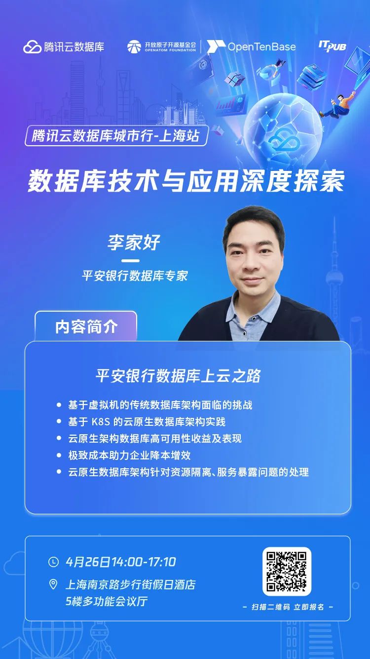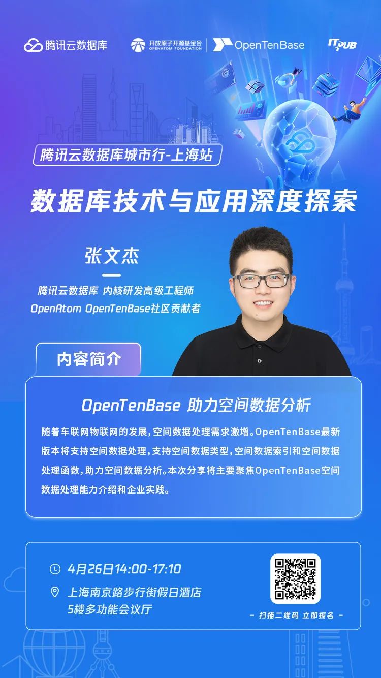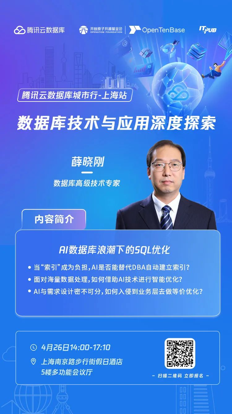 2024年4月26日,“数据库技术与应用深度探索-腾讯云数据库城市行•上海站”,与数据库领域顶尖技术专家面对面,探讨行业最新动态,分享实践案例!