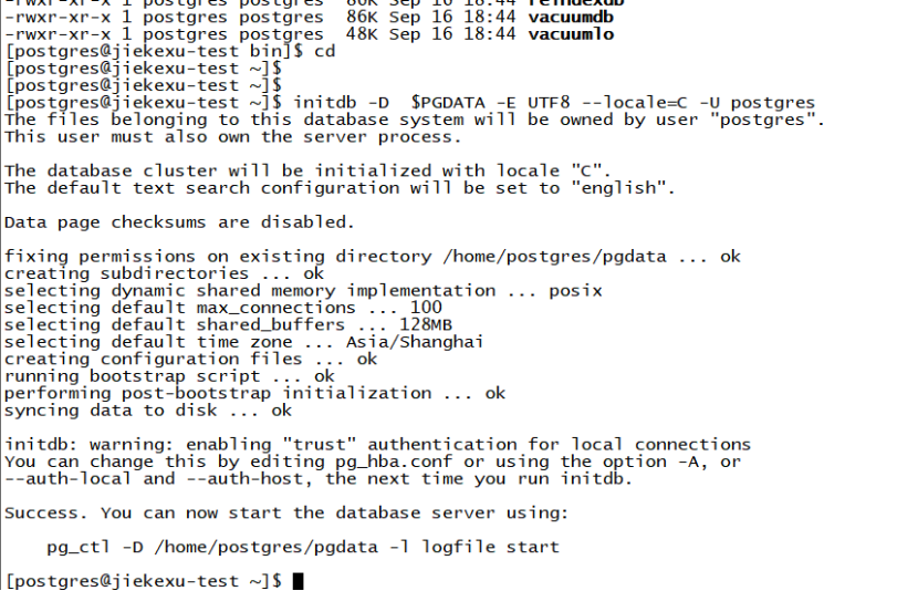 [postgres@jiekexu-test pgdata]$ pg_ctl -D /home/postgres/pgdata start &