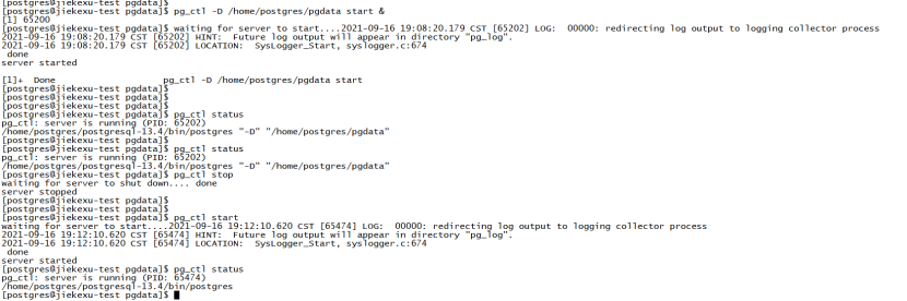 [postgres@jiekexu-test pgdata]$ waiting for server to start....2021-09-16 19:08:20.179 CST [65202] LOG: 00000: redirecting log output to logging collector process