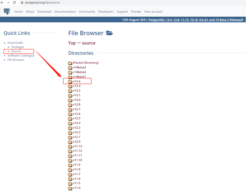 点击 Download 然后选择相对应的安装方式,我这里选择源码安装,点击 Source 选择相应的版本2024年2月8日,最新的PostgreSQL 16.2, 15.6, 14.11, 13.14, and 12.18 发布了! 可能很多公司部署9.x到 14.x 版本的都有涉及,但大多数公司都会选择使用源码编译安装,因为可以定制化一些比如端口、软件安装目录等、我这里是部署的比较早的,选择的是 21 年 8 月份发布的 13.4 版本,https://www.postgresql.org/ftp/source/