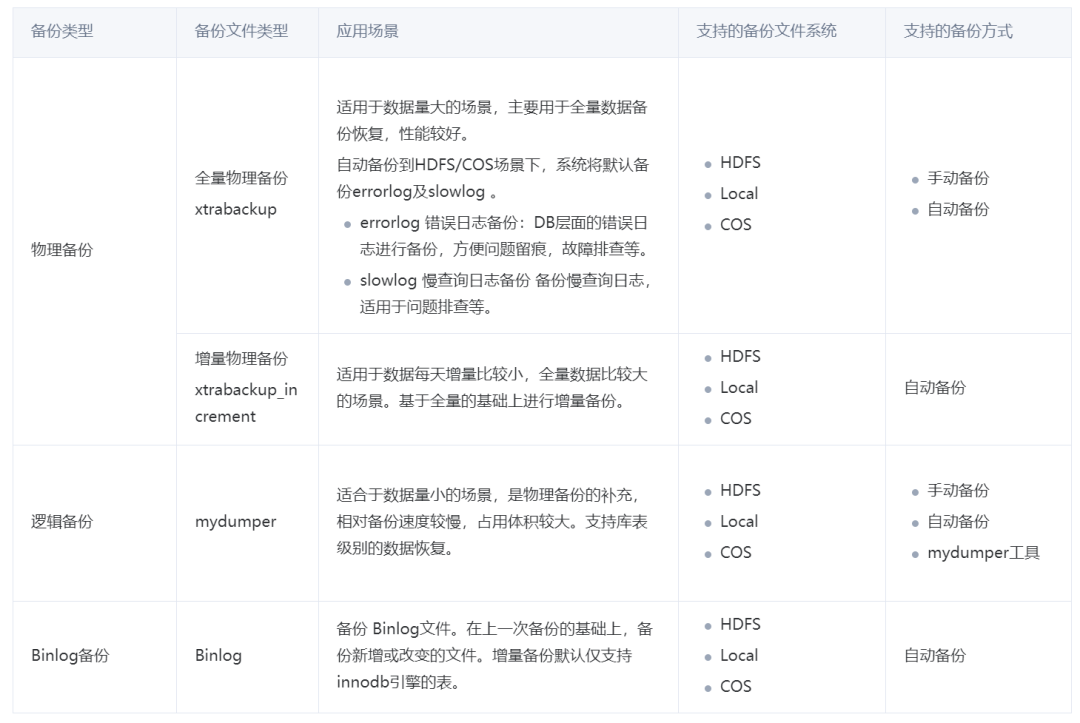 TDSQL MySQL支持三种备份类型,分别为物理备份、逻辑备份和Binlog备份。