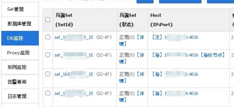登录赤兔管理平台,单击左侧导航栏“实例管理/集群管理”。在实例管理页面,选择所需实例GROUP ID。在DB监控列表可以看到一个Group ID由多个Set组成,每个Set由4台实例组成。正常情况下,同一个Set会指定一个备份节点,实际却看到3个备份节点。从下面的截图看到具体现象情况。