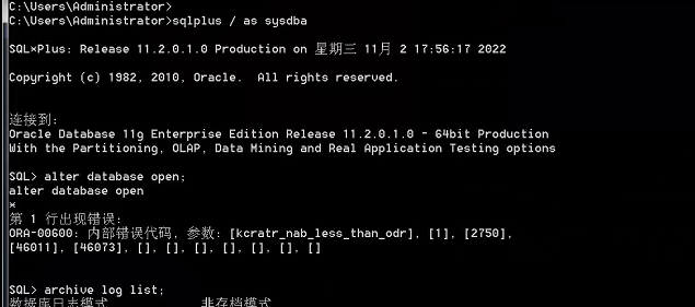 Successfully allocated 3 recovery slavesUsing 45 overflow buffers per recovery slaveThread 1 checkpoint: logseq 2750, block 2, scn 68953003cache-low rba: logseq 2750, block 44095on-disk rba: logseq 2750, block 46073, scn 68970890start recovery at logseq 2750, block 44095, scn 0。。。。WARNING! Crash recovery of thread 1 seq 2750 isending at redo block 46011 but should not have ended beforeredo block 46073Incident 128562 created, dump file: d:\app\administrator\diag\rdbms\orcl\orcl\incident\incdir_128562\orcl_ora_5212_i128562.trcORA-00600: ??????, ??: [kcratr_nab_less_than_odr], [1], [2750], [46011], [46073], [], [], [], [], [], [], []ORA-00600: ??????, ??: [kcratr_nab_less_than_odr], [1], [2750], [46011], [46073], [], [], [], [], [], [], []ORA-00600: ??????, ??: [kcratr_nab_less_than_odr], [1], [2750], [46011], [46073], [], [], [], [], [], [], []