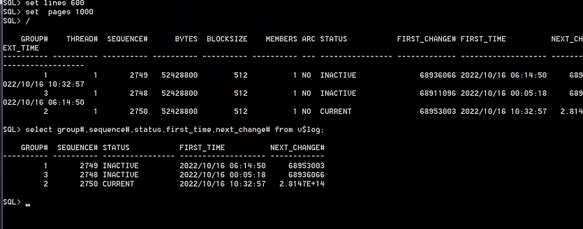 2、查看当前在线重做日志信息。当前日志文件序号为2750。查看数据文件scn与控制文件scn号是一致的,值为68953003。