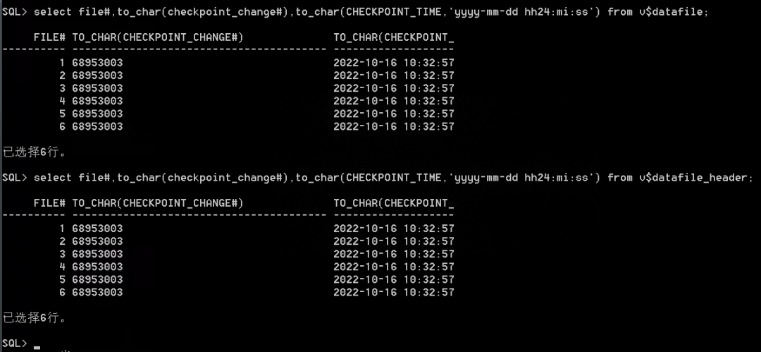 select file#,to_char(checkpoint_change#),to_char(CHECKPOINT_TIME,'yyyy-mm-dd hh24:mi:ss')from v$datafile;select file#,to_char(checkpoint_change#),to_char(CHECKPOINT_TIME,'yyyy-mm-dd hh24:mi:ss')from v$datafile_header;