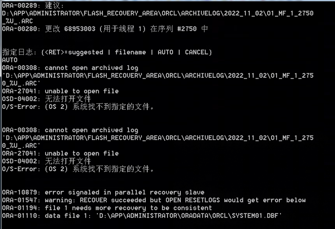 从下面截图来看,数据库自动寻找归档日志,但是归档日志实际上是没打开的。所以找不到归档文件。