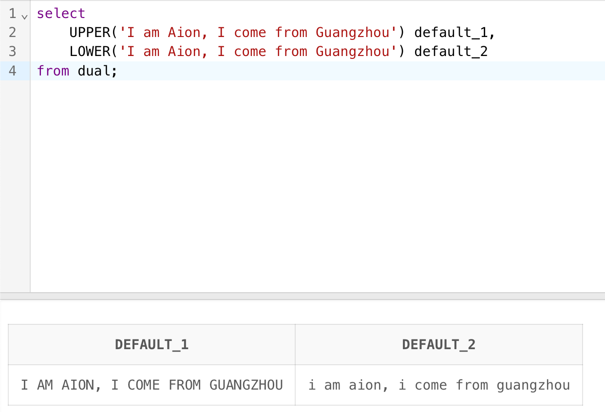 UPPER('I am Aion, I come from Guangzhou') default_1,