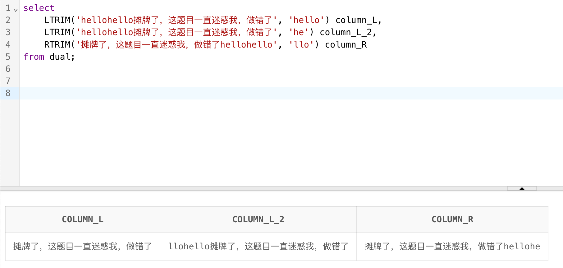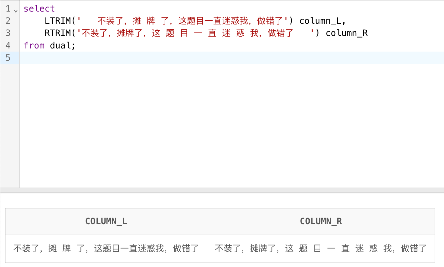 RTRIM('不装了,摊牌了,这 题 目 一 直 迷 惑 我,做错了 ') column_R
